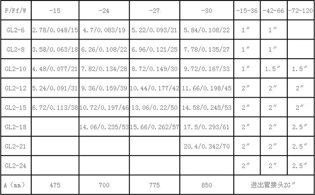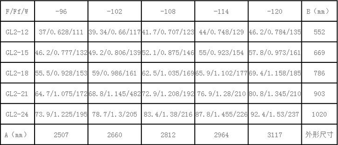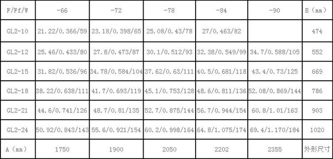 GLⅡ空氣熱交換器散熱面積F(m2)、通風凈截面積Ff(m2)、參考重量W(Kg)、安裝尺寸等一覽表